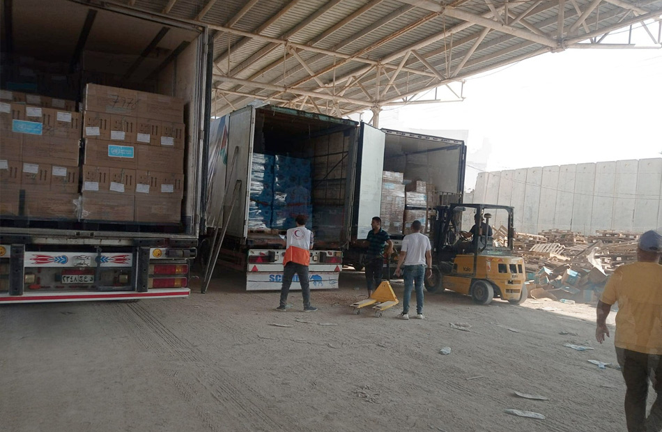 الهلال الأحمر المصري أن الشحنة تضمنت 102 شاحنة من المساعدات الإنسانية تحتوي على غذاء ومياه ومساعدات إغاثية وأدوية ومستلزمات طبية.