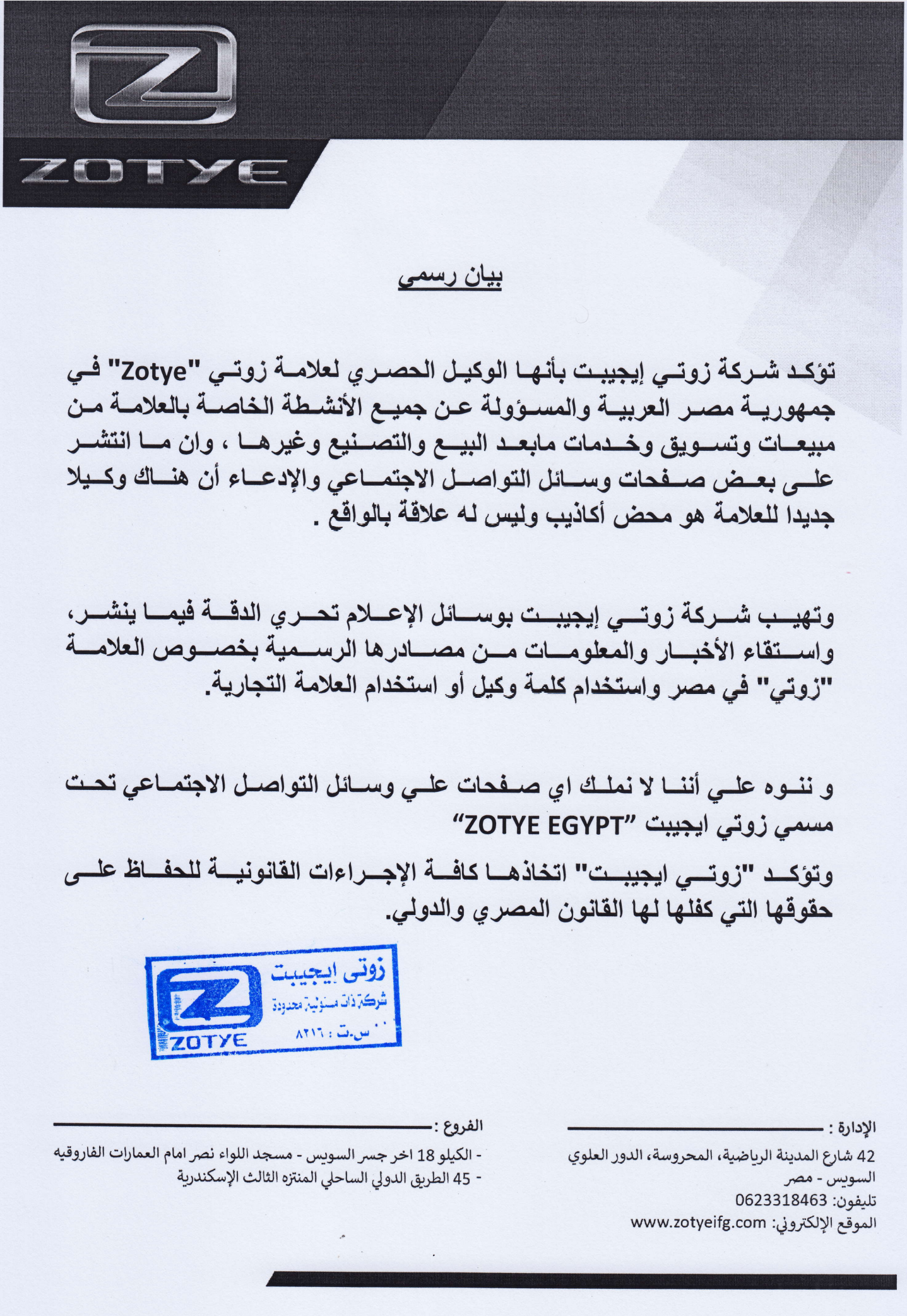 Zotye" في جمهورية مصر العربية والمسؤولة عن جميع الأنشطة الخاصة بالعلامة من مبيعات وتسويق وخدمات ما بعد البيع والتصنيع وغيرها .