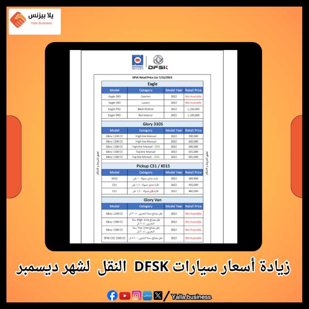 زيادة أسعار سيارات DFSK النقل لشهر ديسمبر