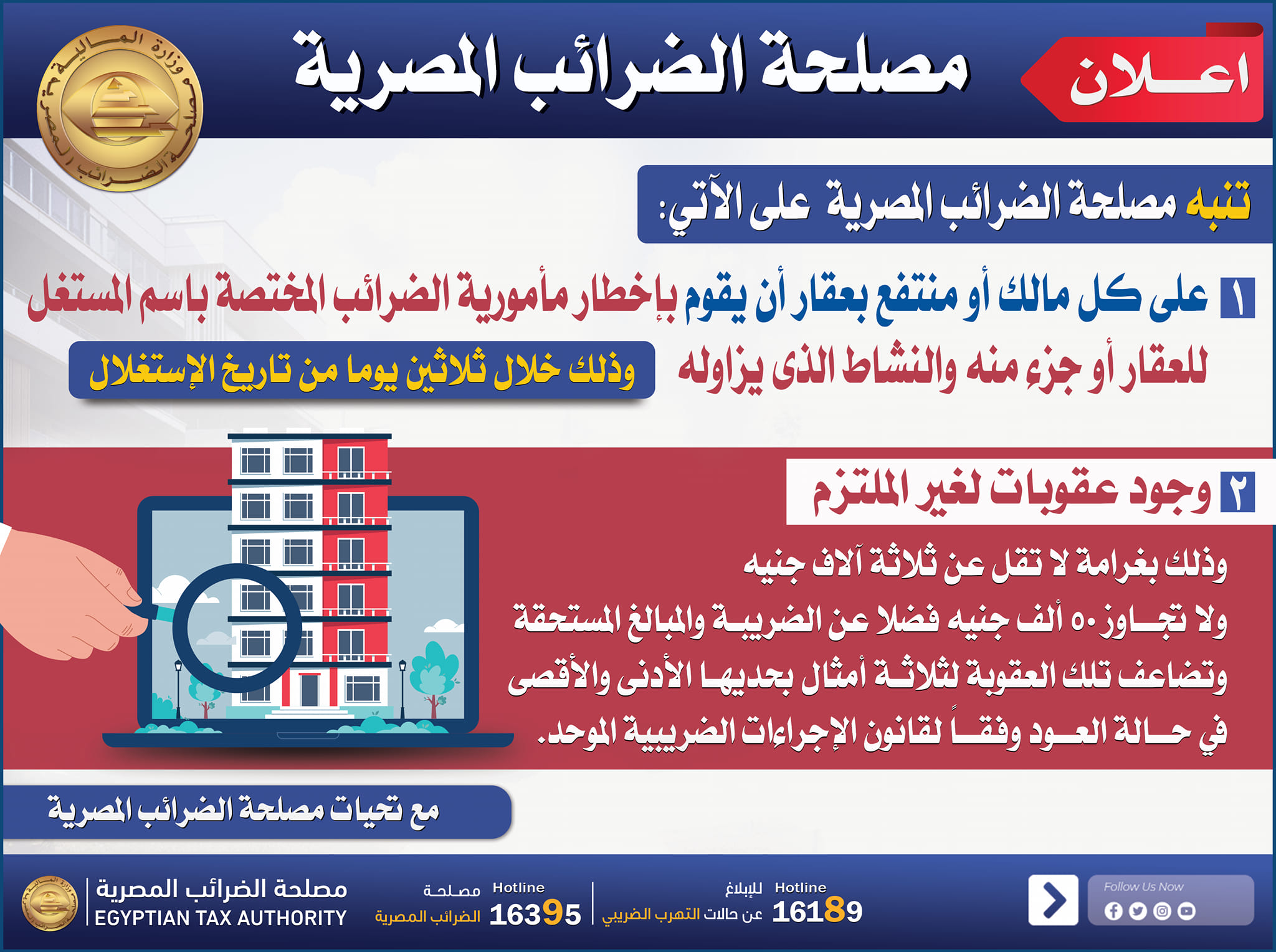 نشرت مصلحة الضرائب المصرية عبر صفحتها على موقع الفيسسبوك، بيانا بشأن أصحاب العقارات والمنتفعين والمستغلين لتلك العقارات، وهذا نصه.