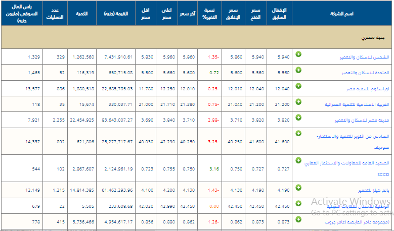 قائمة أسهم العقارات في البورصة المصرية اليوم
