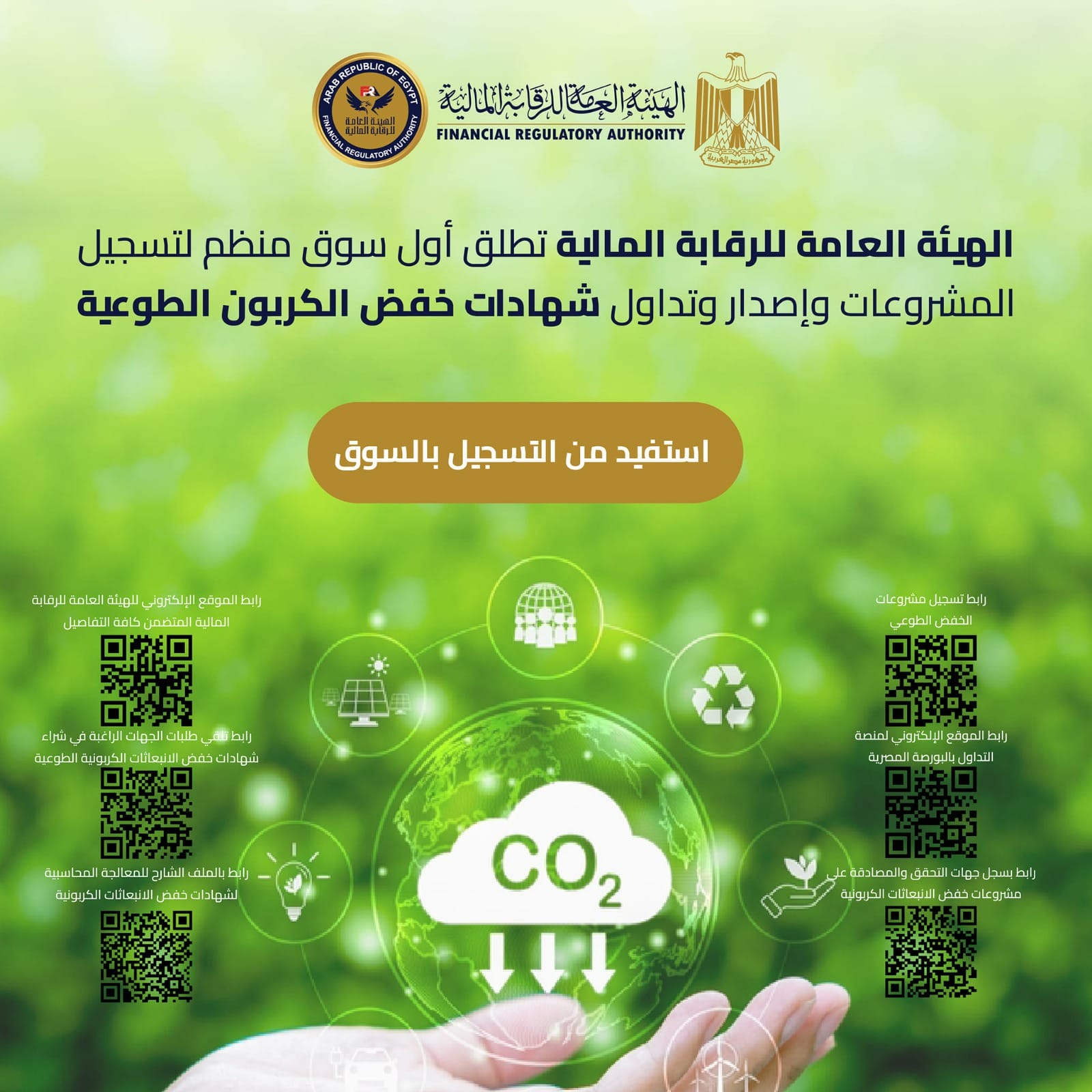 وتدعو الهيئة العامة للرقابة المالية كافة الشركات والجهات لتسجيل مشروعات الخفض الطوعية للكربون في أول سوق منظم ومراقب من خلال الروابط التالية: