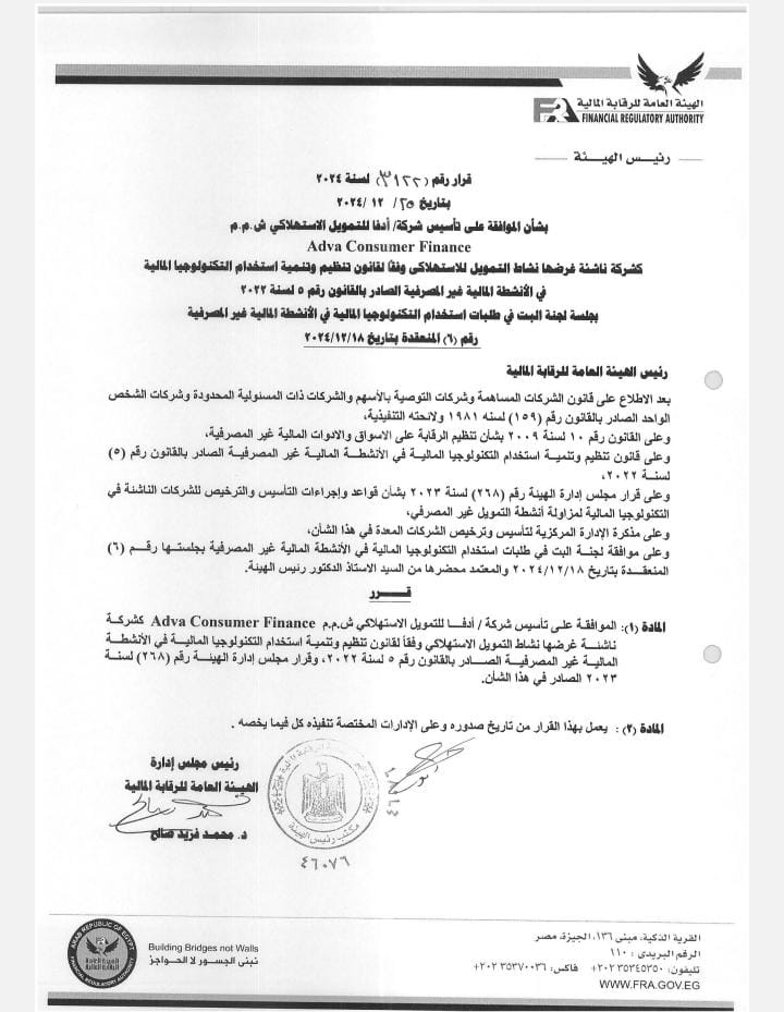وافقت الهيئة العامة للرقابة المالية على تأسيس شركة أدفا للتمول الاستهلاكي كشركة ناشئة غرضها التمويل الاستهلاكي وفقا لقانون تنظيم وتنمية استخدام التكنولوجيا المالية في الأنشطة المالية غير المصرفية الصادر بالقانون رقم 5 لسنة 2022.