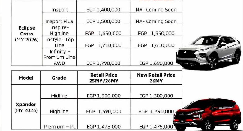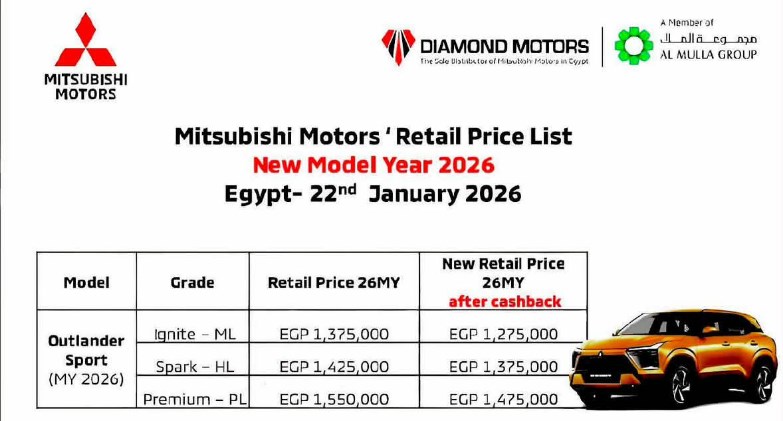 سعر الفئة الأولى1.300,000جنيه. سعر الفئة الثانية 1.390.000جنيه . أسعار ميتسوبيشي اتراج 2024 .