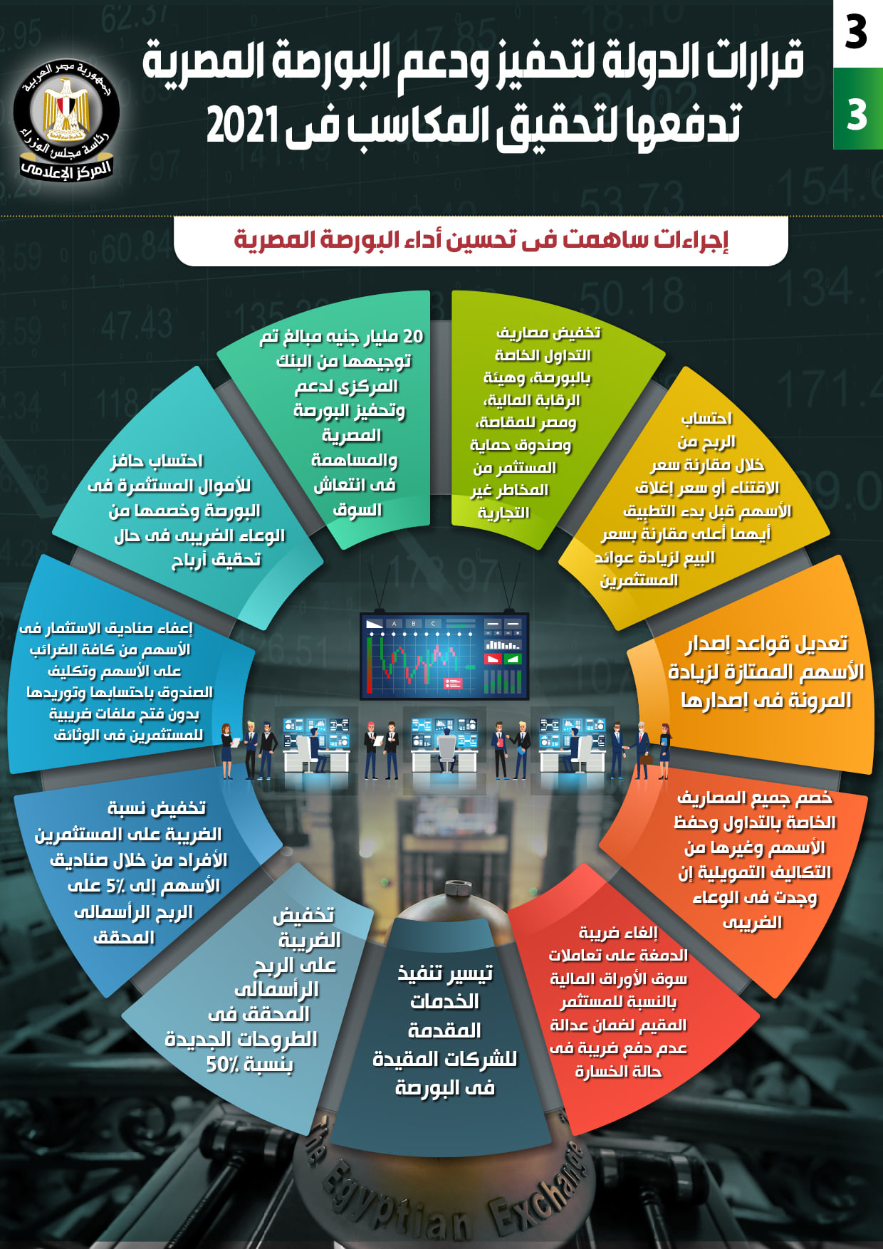 وكذلك تشمل الإجراءات وفقاً لتقرير مكاسب البورصة المصرية ، احتساب حافز للأموال المستثمرة في البورصة وخصمها من الوعاء الضريبي في حال تحقيق أرباح، وتخفيض الضريبة على الربح الرأسمالي المحقق في الطروحات الجديدة بنسبة 50%، فضلاً عن تخفيض نسبة الضريبة على المستثمرين الأفراد من خلال صناديق الأسهم إلى 5% على الربح الرأسمالي المحقق.